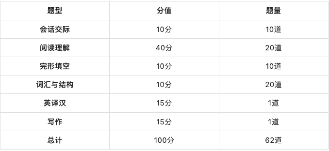 河北地区学位英语2022年下半年考试新增了完形填空题型,目前试卷共6个题型包括会话交际、阅读理解、完形填空、词汇和语法、英译汉和短文写作。