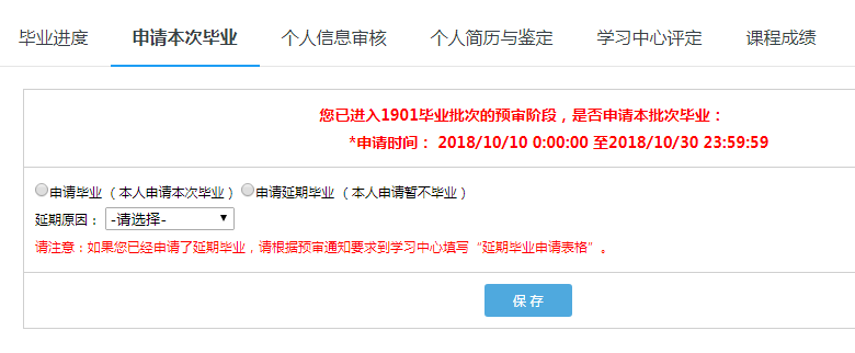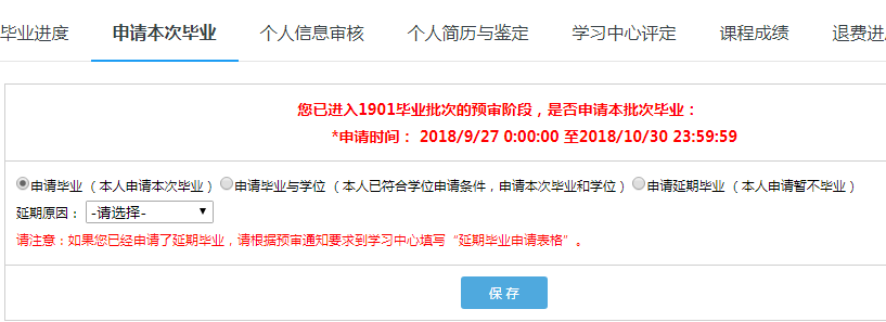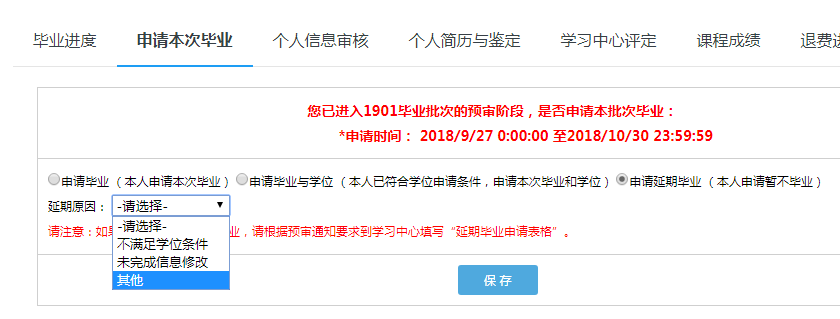 提交延期毕业申请后,平台会让学生选择延期毕业原因: