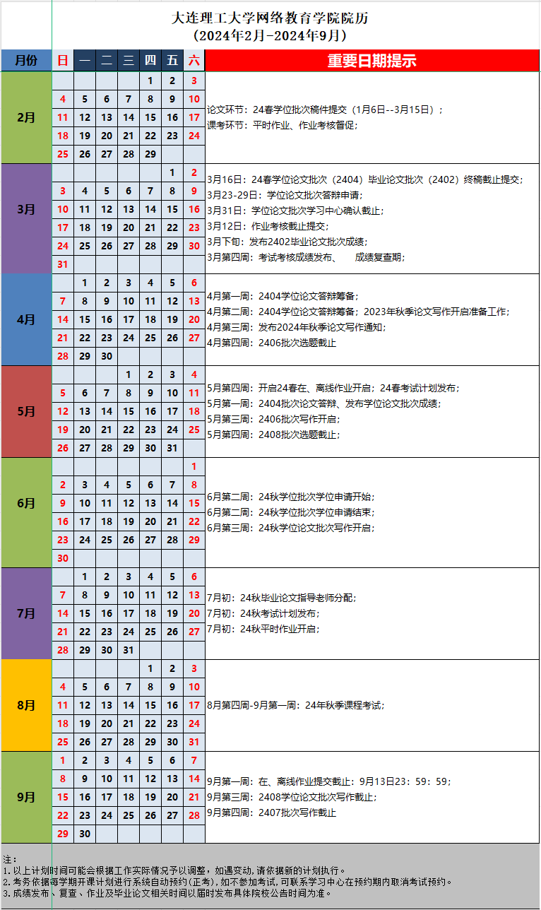 22.24春学期大连理工大学网络教育学院院历(2024年2月-2024年9月).xlsx