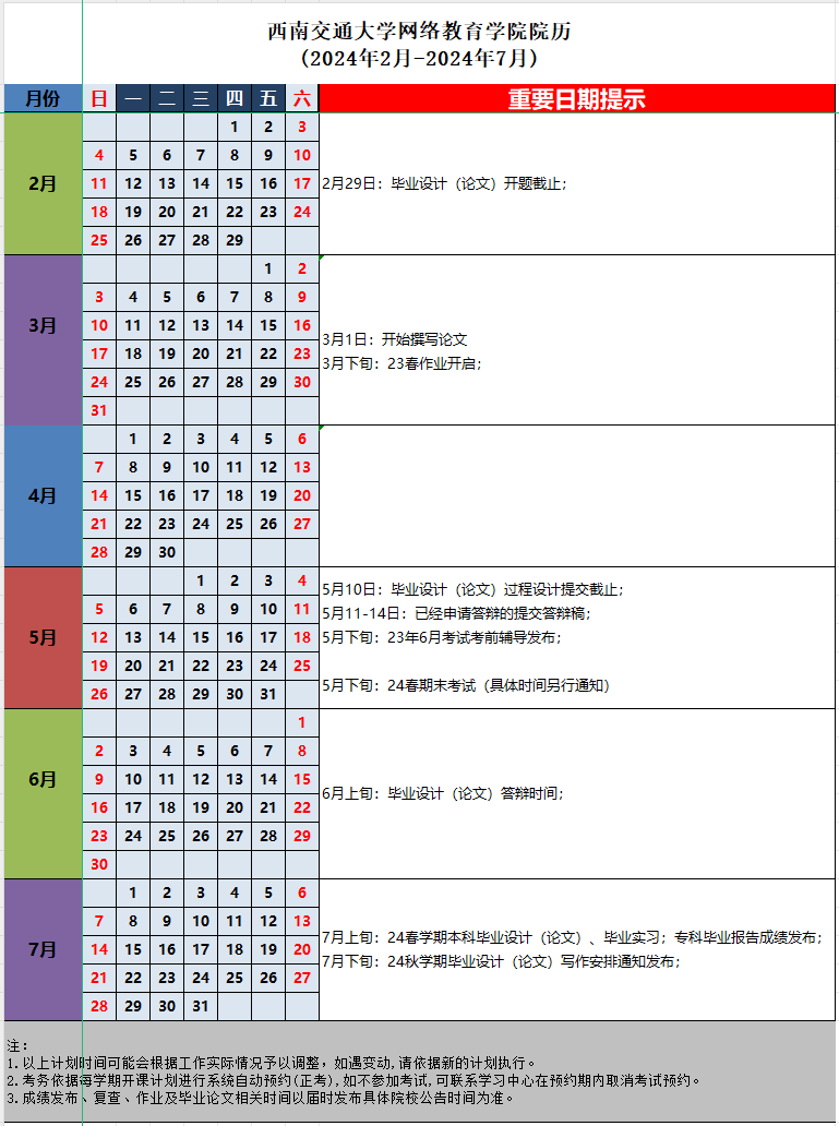 16.24春学期西南交通大学网络教育学院院历(2024年2月-2024年7月).xls