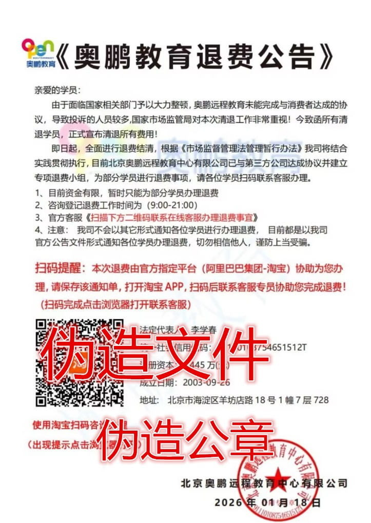 近日有不法分子假借北京奥鹏远程教育中心有限公司(以下简称“奥鹏教育”)的名义,冒充奥鹏教育工作人员,伪造各类文件、公章,散播虚假信息,通过网络平台、某宝等第三方机构、微信、电话、QQ群等方式,以帮助学生办理退费的名义,让学生进入某宝平台,骗取学生个人信息和钱财,实施诈骗。